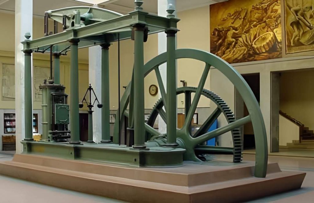 Máquina de vapor de Watt, procedente de la Fábrica Nacional de Moneda y Timbre, expuesta en el vestíbulo de la Escuela Técnica Superior de Ingenieros Industriales de Madrid.Autor: Nicolás Pérez, Wikipedia.