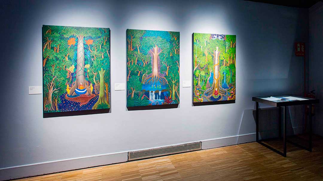- Dimas Paredes, La lupuna blanca, 2019; Wacra renaco, 2018 eta Ajos kiro, 2019. Olioa oihalaren gainean. AWA Gallery | © CCCB, 2021