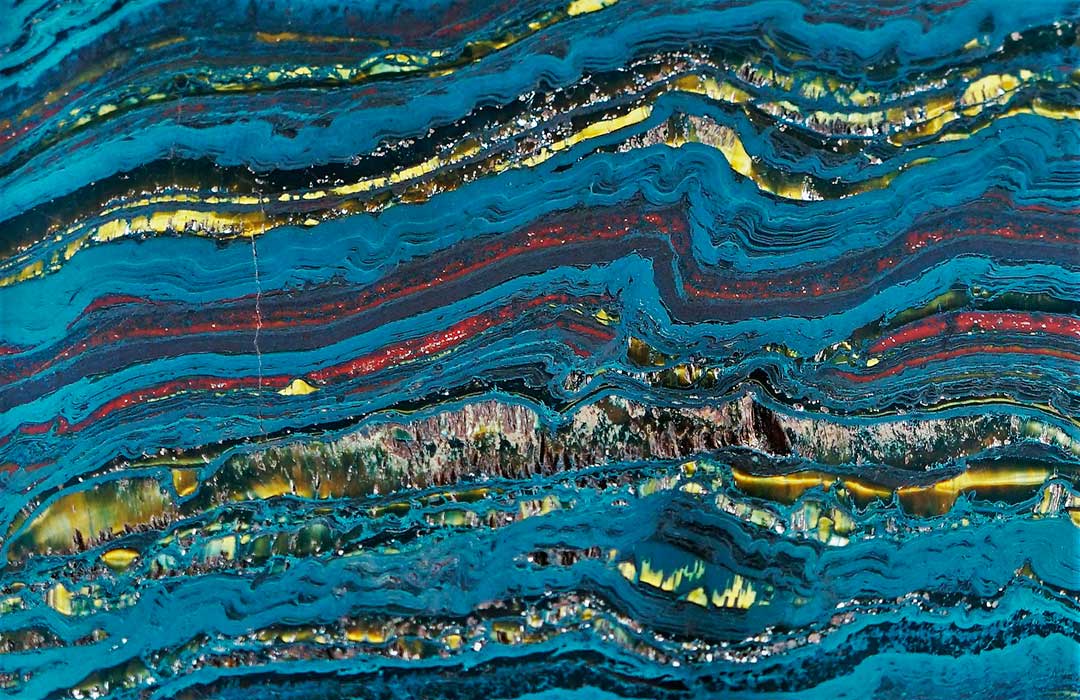 - Tiger Iron estromatolitoa Zianobakterio prokariotoak. Alga urdinak. Kanbriarraurre Proterozoikoa. 2.600 milioi urte. Port Hedland, Australia.