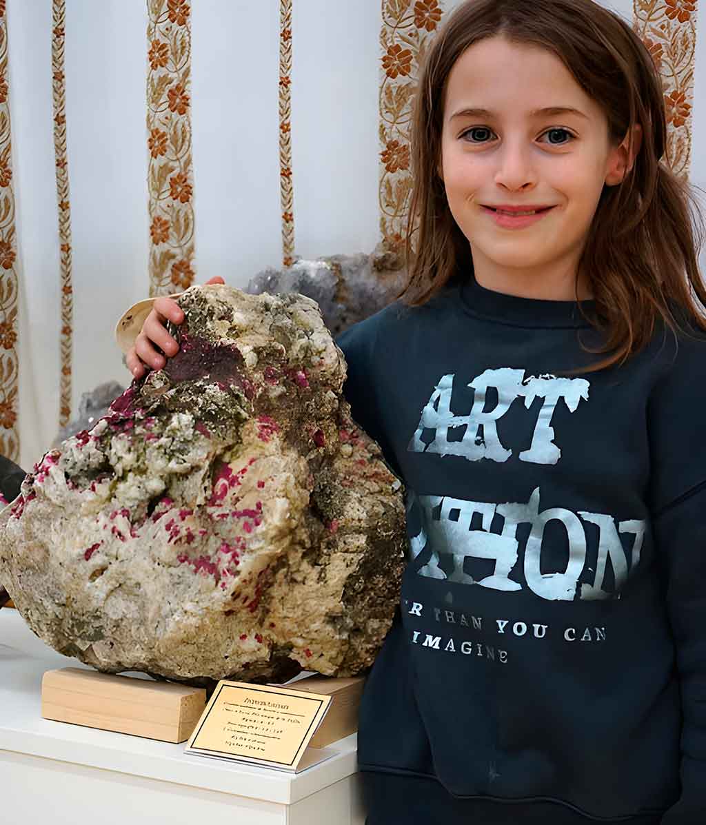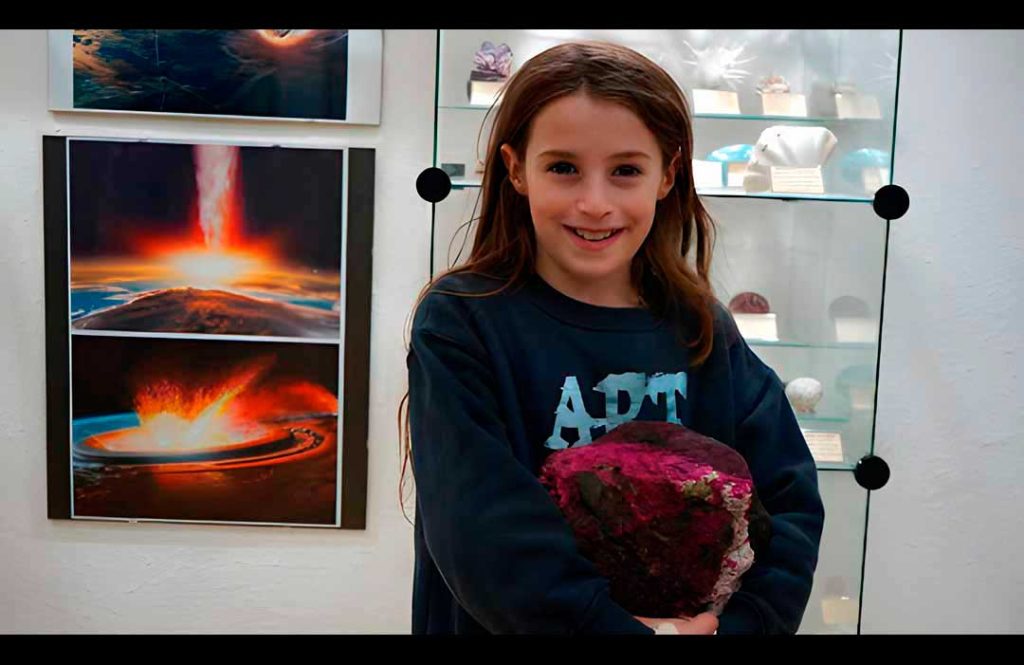 Hace algunos meses, concretamente en mayo del año 2023 un aficionado a pasear por el monte nos remitió un mensaje informándonos de que su hija Maddi Lasuen de tan solo 8 años de edad había localizado una roca muy curiosa mientras jugaba en el arroyo de San Lorenzo.  Según su padre Igor, un fiel y entusiasta colaborador del museo además de buen amigo, la roca parecía un fósil. El fragmento pétreo  en cuestión, la guardó su hija en la guantera del coche ya sin concederle mayor importancia. Lo más chocante según nos contó Igor en nuestro primer contacto, es que la pieza según pasaban los días iba tomando una coloración más intensa y acusada de un fuerte color púrpura, hecho que nos llamó poderosamente la atención ya que lo más normal y que suele suceder siempre es que cuando los minerales se secan y deshidratan pierden gran parte de su color y brillo, volviéndose menos vistoso y atractivo.