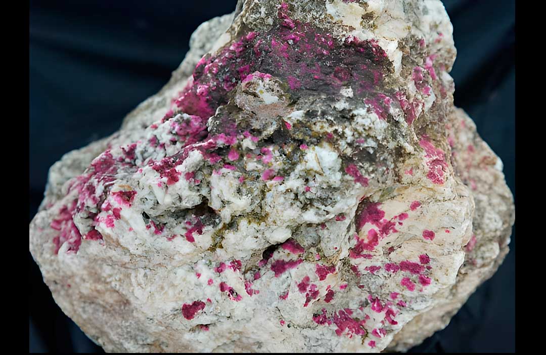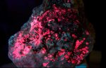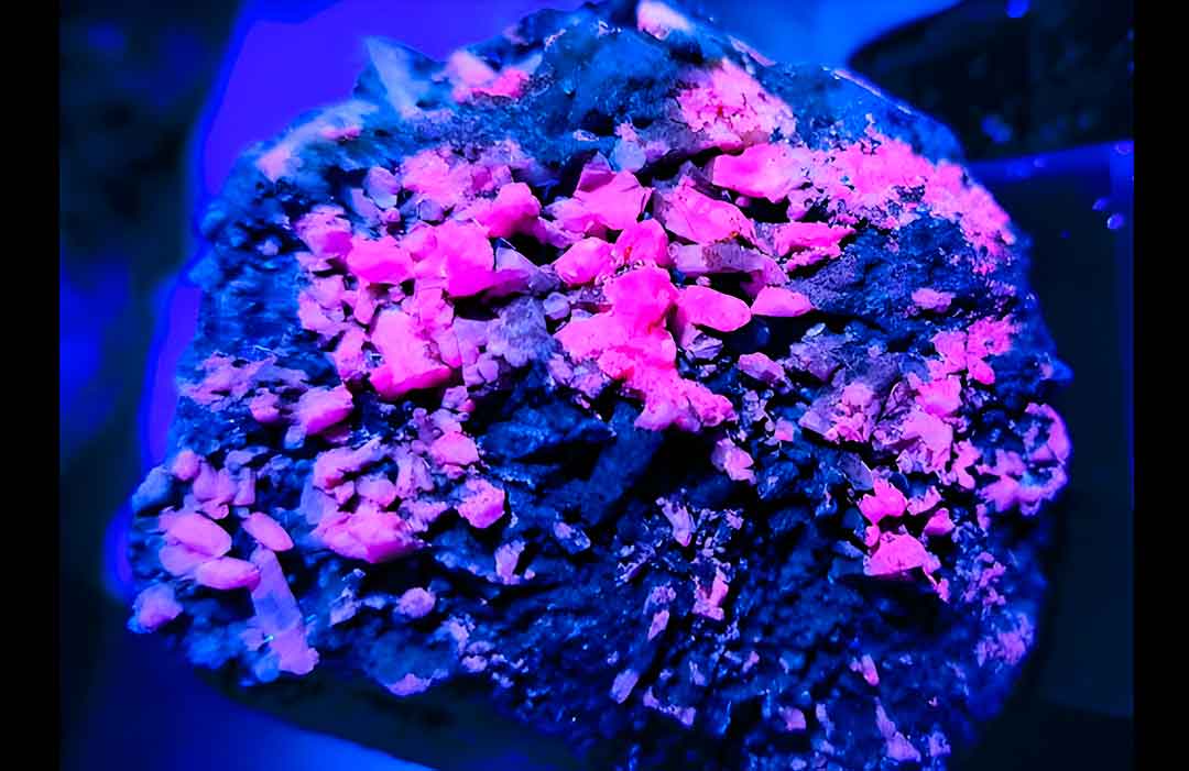 Debido al interés mostrado por nosotros hacia la roca, Igor acompañado de su hija Maddi acudió al museo para llevárnosla y en principio corroboramos el extraño efecto de esta roca que cuando está mojada pierde parte de su color y cuando se deshidrata adquiere una fuerte tonalidad púrpura. Estudiando con más detenimiento pudimos observar que la roca era un basalto en forma de canto rodado por la acción del agua y que está recubierta por una fina pátina que le confiere dicho color púrpura intenso. Esta patina no solo se adhiere a rocas basálticas ya que también la hemos encontrado sobre cuarzos masivos y otros bien definidos y cristalizados con la misma pátina. Este recubrimiento es estable y muy difícil de eliminar por acción mecánica de frotamiento, con ciertos ácidos salta parte de la película pero sin llegar a disolverse, tampoco en principio parece ninguna materia orgánica tipo liquen o algún alga que se desarrolle en el agua, ya que suponemos que perdería el color con la deshidratación y en este caso es el efecto totalmente contrario. Otra característica muy curiosa de las rocas es la fluorescencia de tonalidad anaranjada que se produce al ser iluminadas con la luz UVA de 365 nm. Intensidad que corresponde con ondas de luz larga ya que está entre el rango de los 315 a los 400 nm. Hecho que en principio nos indujo a creer en que podría tratarse de algún tipo o residuo de materia orgánica que se adhiere a las rocas y que ahora creemos descartada ya que tampoco con la acción de los ácidos, jabones e incluso con los ultrasonidos se mantienen en la roca y no se eliminan.